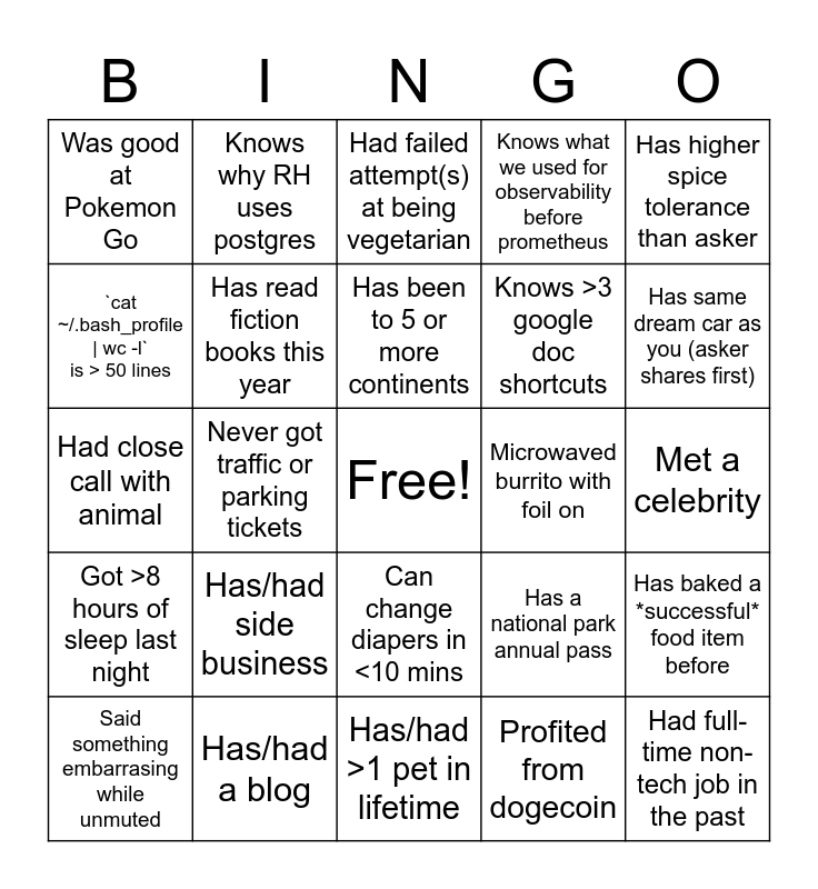 This bingo card has a free space and 29 words: Said something embarrasing while unmuted, Has VC'd in pajamas, Never got traffic or parking tickets, Yubi-sneezed in a public channel, Was good at Pokemon Go, Had failed attempt(s) at being vegetarian, Has read fiction books this year, Has/had side business, Microwaved burrito with foil on, Has/had a blog, Met a celebrity, Had full-time non-tech job in the past, Has/had >1 pet in lifetime, Profited from dogecoin, Has same dream car as you (asker shares first), Plays >2 instruments, Can change diapers in <10 mins, Got >8 hours of sleep last night, Has higher spice tolerance than asker, Had close call with animal, Has a national park annual pass, Has played a non-lethal squid game before, Knows >3 google doc shortcuts, `cat ~/.bash_profile | wc -l` is > 50 lines, Knows what we used for observability before prometheus, Knows why RH uses postgres, Has baked a *successful* food item before, Has been to 5 or more continents and Remembers definition of cosine.