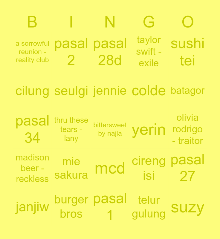 This bingo card has 25 words: mie sakura, pasal 1, jennie, janjiw, sushi tei, a sorrowful reunion - reality club, cilung, pasal 2, yerin, mcd, colde, pasal 34, cireng isi, pasal 27, seulgi, suzy, olivia rodrigo - traitor, pasal 28d, batagor, thru these tears - lany, bittersweet by najla, burger bros, madison beer - reckless, taylor swift - exile and telur gulung.