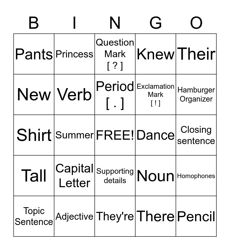 This bingo card has a free space and 24 words: Capital Letter, Adjective, Period [ . ], Topic Sentence, Their, Pants, New, Princess, Dance, Supporting details, Exclamation Mark [ ! ], Shirt, Noun, Homophones, Verb, There, Closing sentence, Question Mark [ ? ], Hamburger Organizer, Summer, Pencil, Tall, Knew and They're.