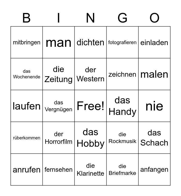 This bingo card has a free space and 44 words: der Actionfilm, anfangen, anhaben, anrufen, aufmachen, die Briefmarke, dichten, einkaufen, einladen, fernsehen, fotografieren, das Handy, das Hobby, der Horrorfilm, das Kino, die Klarinette, die Komödie, laufen, der Liebesfilm, malen, man, manchmal, der Mann, mitbringen, die Münze, nie, oft, das Poster, die Rockmusik, rüberkommen, sammeln, das Schach, Ski laufen, trainieren, das Vergnügen, vorhaben, vorschlagen, weise, der Western, das Wochenende, zeichnen, der Zeichentrickfilm, die Zeitung and der Zirkus.