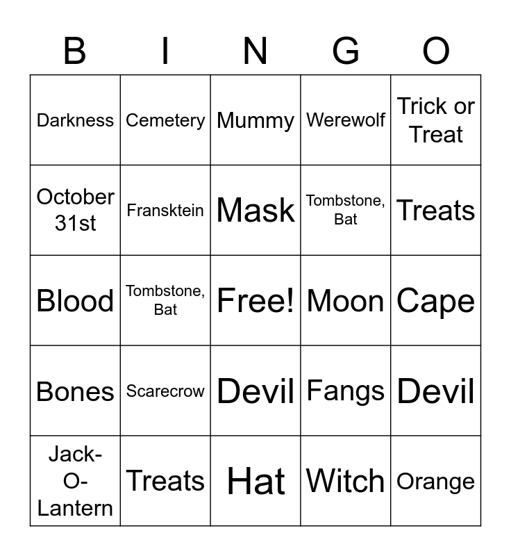 ⚠ This card has duplicate items: Black cat (2), Spider (2), Hat (2), Cauldron (2), Witch (2), Broom (2), Vampire (2), Jack-O-Lantern (2), Ghost (2), Haunted house (2), Potion (2), Eyeball (2), Gravestone (2), Tombstone, Bat (2), Cobweb (2), Trick or Treat (2), Mummy (2), Zombie (2), Book of spells (2), Wizard (2), Costume (2), October 31st (2), Coffin (2), Skeleton (2), Scarecrow (2), Fransktein (2), Monster (2), Werewolf (2), Raven (2), Night (2), Treats (2), Devil (2), Candy bag (2), Skull (2), Cemetery (2), Owl (2), Moon (2), Darkness (2), Mask (2), Fangs (2), Blood (2), Bones (2), Cape (2), Fairy (2), Orange (2), Black (2), Purple (2)