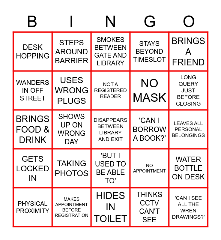 This bingo card has 25 words: TAKING PHOTOS, HIDES IN TOILET, NOT A REGISTERED READER, PHYSICAL PROXIMITY, BRINGS A FRIEND, DESK HOPPING, WANDERS IN OFF STREET, STEPS AROUND BARRIER, 'CAN I BORROW A BOOK?', 'BUT I USED TO BE ABLE TO', NO MASK, BRINGS FOOD & DRINK, NO APPOINTMENT, WATER BOTTLE ON DESK, USES WRONG PLUGS, 'CAN I SEE ALL THE WREN DRAWINGS?', LEAVES ALL PERSONAL BELONGINGS, SMOKES BETWEEN GATE AND LIBRARY, LONG QUERY JUST BEFORE CLOSING, SHOWS UP ON WRONG DAY, DISAPPEARS BETWEEN LIBRARY AND EXIT, MAKES APPOINTMENT BEFORE REGISTRATION, GETS LOCKED IN, STAYS BEYOND TIMESLOT and THINKS CCTV CAN'T SEE.