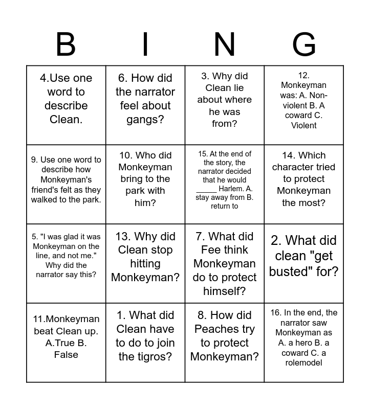 This bingo card has 16 words: 1. What did Clean have to do to join the tigros?, 2. What did clean "get busted" for?, 3. Why did Clean lie about where he was from?, 4.Use one word to describe Clean., 5. "I was glad it was Monkeyman on the line, and not me." Why did the narrator say this?, 6. How did the narrator feel about gangs?, 7. What did Fee think Monkeyman do to protect himself?, 8. How did Peaches try to protect Monkeyman?, 9. Use one word to describe how Monkeyman's friend's felt as they walked to the park., 10. Who did Monkeyman bring to the park with him?, 11.Monkeyman beat Clean up. A.True B. False, 12. Monkeyman was: A. Non-violent B. A coward C. Violent, 13. Why did Clean stop hitting Monkeyman?, 14. Which character tried to protect Monkeyman the most?, 15. At the end of the story, the narrator decided that he would _____ Harlem. A. stay away from B. return to and 16. In the end, the narrator saw Monkeyman as A. a hero B. a coward C. a rolemodel.