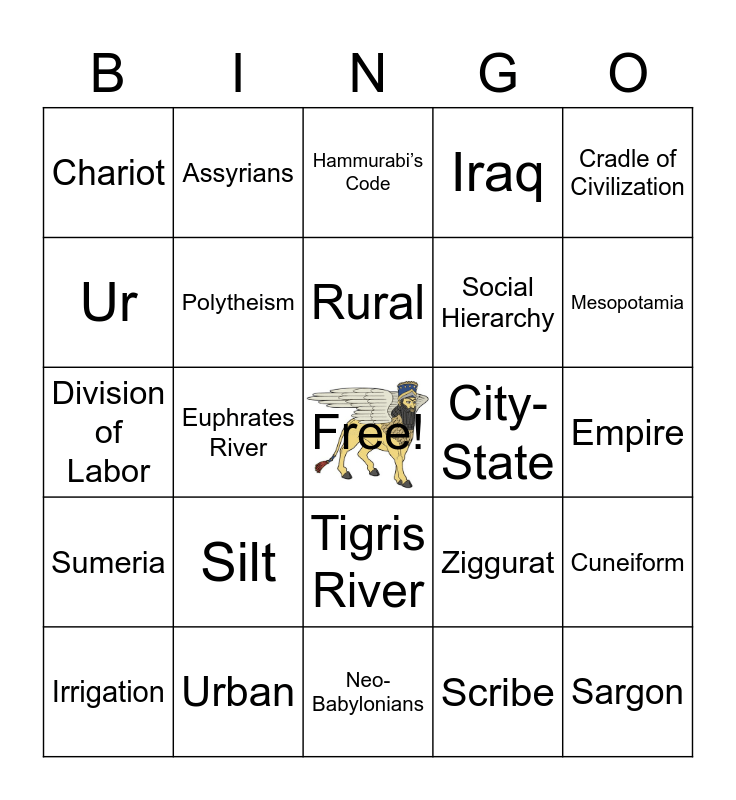 This bingo card has a free space and 24 words: Silt, Urban, Rural, Irrigation, Cradle of Civilization, Chariot, Ur, Assyrians, City-State, Tigris River, Social Hierarchy, Division of Labor, Ziggurat, Cuneiform, Polytheism, Scribe, Empire, Hammurabi’s Code, Mesopotamia, Euphrates River, Sargon, Sumeria, Iraq and Neo-Babylonians.