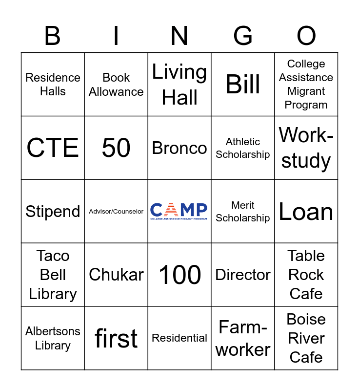 This bingo card has a free space and 24 words: Chukar, first, Bronco, Albertsons Library, College Assistance Migrant Program, Residence Halls, CTE, Book Allowance, Merit Scholarship, 100, Athletic Scholarship, Stipend, Director, Table Rock Cafe, 50, Farm-worker, Loan, Living Hall, Work-study, Advisor/Counselor, Boise River Cafe, Taco Bell Library, Bill and Residential.