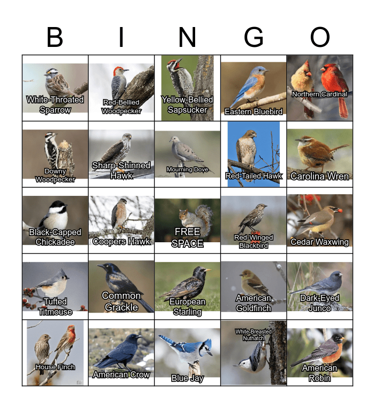 This bingo card has 24 images, a free space and 24 words: House Finch, Common Grackle, Mourning Dove, White-Breasted Nuthatch, Northern Cardinal, White-Throated Sparrow, Red-Bellied Woodpecker, Yellow-Bellied Sapsucker, Red-Winged Blackbird, Cedar Waxwing, Black-Capped Chickadee, Sharp-Shinned Hawk, American Goldfinch, Dark-Eyed Junco, Downy Woodpecker, American Crow, Blue Jay, Eastern Bluebird, Carolina Wren, Tufted Titmouse, Coopers Hawk, European Starling, Red-Tailed Hawk and American Robin.