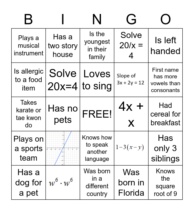 This bingo card has 4 images, a free space and 20 words: Loves to sing, Has a dog for a pet, Is left handed, Plays a musical instrument, Is allergic to a food item, Has a two story house, 4x + x, Knows how to speak another language, Takes karate or tae kwon do, Has only 3 siblings, Solve 20x=4, Was born in Florida, Had cereal for breakfast, Is the youngest in their family, First name has more vowels than consonants, Has no pets, Knows the square root of 9, Plays on a sports team, Solve 20/x = 4 and Was born in a different country.