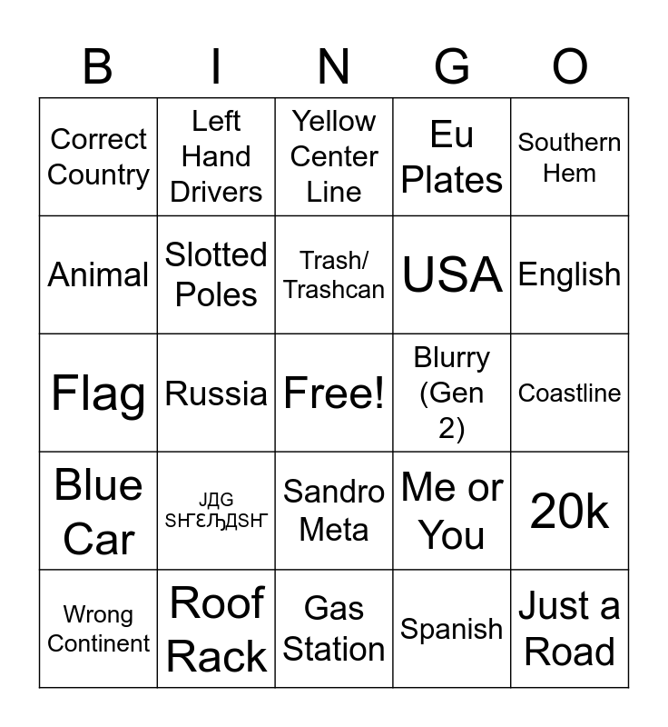 This bingo card has a free space and 24 words: JДG SҤԐԠДSҤ, Roof Rack, Trash/ Trashcan, Wrong Continent, Southern Hem, Correct Country, Animal, Left Hand Drivers, Blurry (Gen 2), Sandro Meta, USA, Flag, Me or You, 20k, Slotted Poles, Spanish, Coastline, Yellow Center Line, English, Russia, Just a Road, Blue Car, Eu Plates and Gas Station.