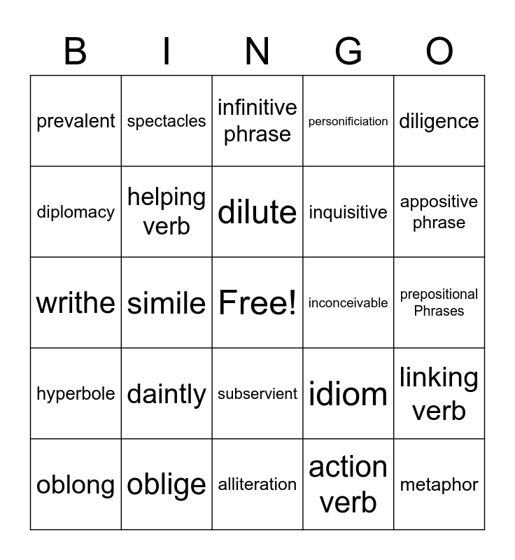 This bingo card has a free space and 24 words: daintly, oblige, dilute, oblong, diligence, prevalent, diplomacy, spectacles, inconceivable, subservient, inquisitive, writhe, idiom, linking verb, helping verb, action verb, prepositional Phrases, infinitive phrase, appositive phrase, simile, metaphor, hyperbole, personificiation and alliteration.