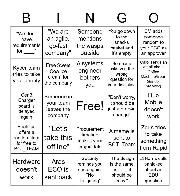 This bingo card has a free space and 24 words: "Let's take this offline", Aras ECO is sent back, A systems engineer bothers you, Hardware doesn't work, CM adds someone random to your ECO as an approver, "We don't have requirements for ____", Kyber team tries to take your priority, "We are an agile, go-fast company", "Don't worry, it should be just a drop-in change", Procurement timeline makes your project late, Someone asks you the wrong question for your discipline, Gen3 Charger board is delayed again, A meme is sent to BCT_Team, Zeus tries to take something from Rapid, Free Sweet Cow ice cream for the company, "The design is the same as ___, it should be easy.", Duo Mobile doesn't work, Someone mentions the wasps outside, Carol sends an email about Coffee Machine/Bean Grinder breaking, Someone in your team leaves the company, L3Harris calls panicked about an EDU question, Facilities offers a random item for free to BCT_TEAM, You go down to the snacks basket and it's empty and Security reminds you once again: "No Tailgating".