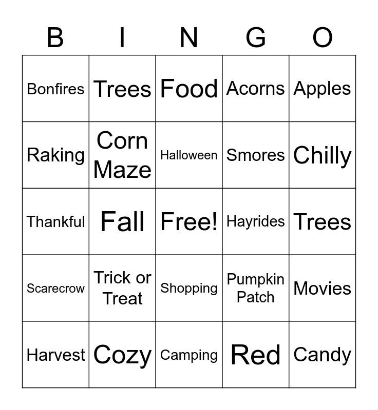 This bingo card has a free space and 29 words: Harvest, Leaves, Fall, Gourds, Bonfires, Food, Corn Maze, Trick or Treat, Hayrides, Cozy, Trees, Candy, Camping, Red, Chilly, Windy, Shopping, Scarecrow, Apples, Thankful, Pumpkin Patch, Pie, Smores, Raking, Acorns, Trees, Movies, Halloween and Squash.