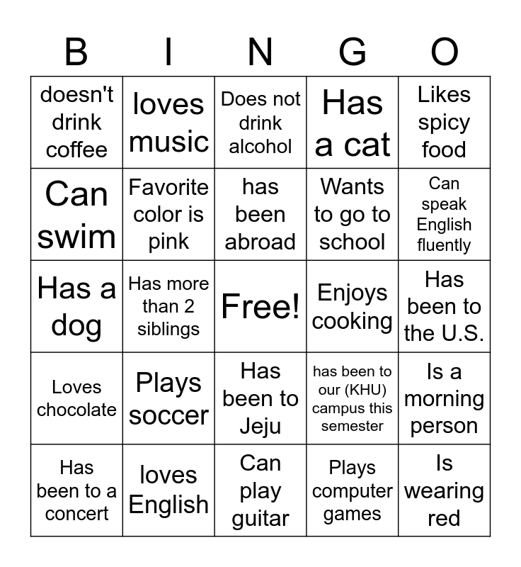 This bingo card has a free space and 24 words: Plays soccer, loves English, has been abroad, Has been to a concert, Likes spicy food, doesn't drink coffee, Can swim, loves music, Enjoys cooking, Has been to Jeju, Wants to go to school, Has a dog, has been to our (KHU) campus this semester, Is a morning person, Favorite color is pink, Plays computer games, Has been to the U.S., Does not drink alcohol, Can speak English fluently, Has more than 2 siblings, Is wearing red, Loves chocolate, Has a cat and Can play guitar.