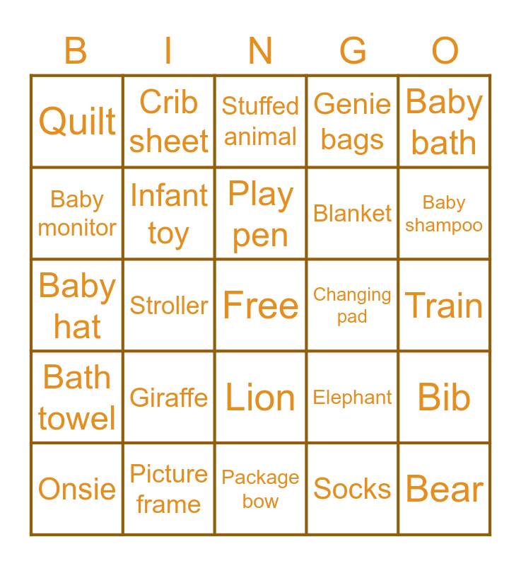 This bingo card has a free space and 28 words: Bib, Pacifier, Blanket, Socks, Baby monitor, Stuffed animal, Crib sheet, Bath towel, Changing pad, Onsie, Baby hat, Genie bags, Picture frame, Package bow, Baby shampoo, Dinosaur, Giraffe, Infant toy, Play pen, Lion, Quilt, Train, Bear, Stroller, Train, Elephant, Baby bath and Growth chart.