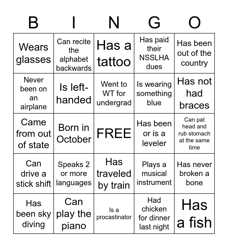 This bingo card has a free space and 24 words: Speaks 2 or more languages, Can play the piano, Went to WT for undergrad, Has been sky diving, Has been out of the country, Wears glasses, Never been on an airplane, Can recite the alphabet backwards, Has been or is a leveler, Has traveled by train, Is wearing something blue, Came from out of state, Plays a musical instrument, Has never broken a bone, Is left-handed, Had chicken for dinner last night, Can pat head and rub stomach at the same time, Has a tattoo, Has not had braces, Born in October, Has a fish, Can drive a stick shift, Has paid their NSSLHA dues and Is a procastinator.