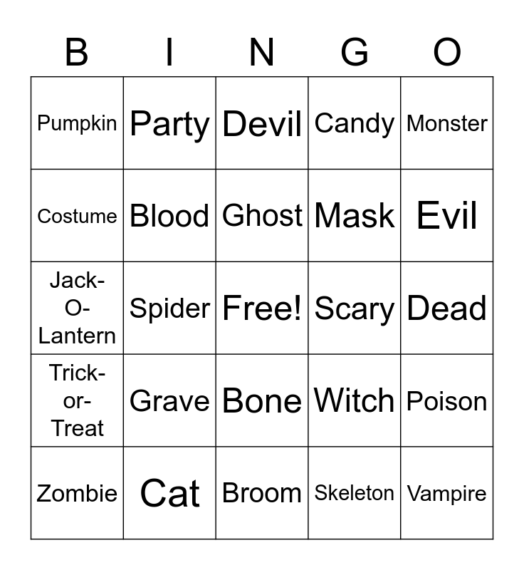 This bingo card has a free space and 35 words: Halloween, Bat, Black, Blood, Bone, Candy, Costume, Frankenstein, Ghost, Haunted House, Jack-O-Lantern, Monster, Oct. 31, Orange, Pumpkin, Scary, Skeleton, Spider, Trick-or-Treat, Vampire, Witch, Zombie, Poison, Cat, Devil, Evil, Werewolf, Moon, Mask, Dead, Magic, Broom, Grave, Party and Night.