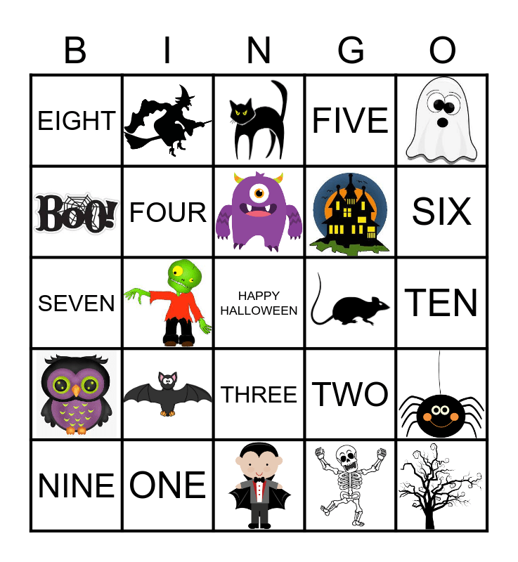 This bingo card has 14 images, a free space and 10 words: ONE, NINE, EIGHT, THREE, SEVEN, TWO, FOUR, TEN, SIX and FIVE.