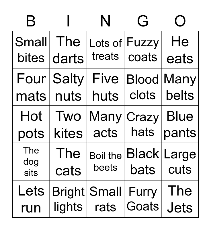 This bingo card has a free space and 24 words: The cats, Bright lights, Five huts, Lets run, He eats, Small bites, Four mats, The darts, Crazy hats, Boil the beets, Blood clots, Hot pots, Black bats, Large cuts, Salty nuts, Furry Goats, Blue pants, Lots of treats, Many belts, Two kites, The Jets, The dog sits, Fuzzy coats and Small rats.