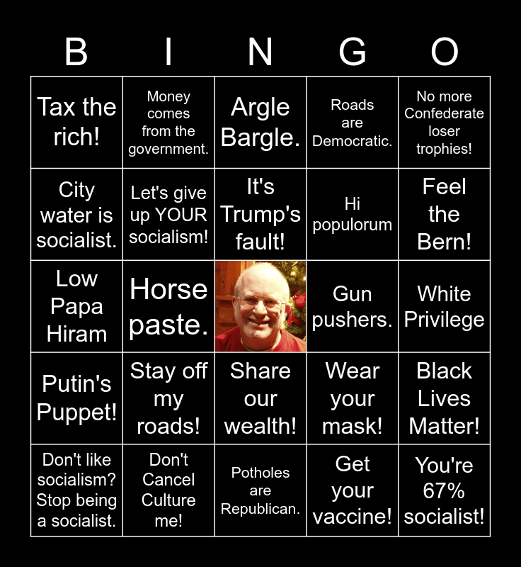 This bingo card has a free space and 24 words: Stay off my roads!, Don't Cancel Culture me!, It's Trump's fault!, Don't like socialism? Stop being a socialist., No more Confederate loser trophies!, Tax the rich!, City water is socialist., Money comes from the government., Gun pushers., Share our wealth!, Hi populorum, Low Papa Hiram, Wear your mask!, Black Lives Matter!, Let's give up YOUR socialism!, Get your vaccine!, White Privilege, Argle Bargle., Feel the Bern!, Horse paste., You're 67% socialist!, Putin's Puppet!, Roads are Democratic. and Potholes are Republican..