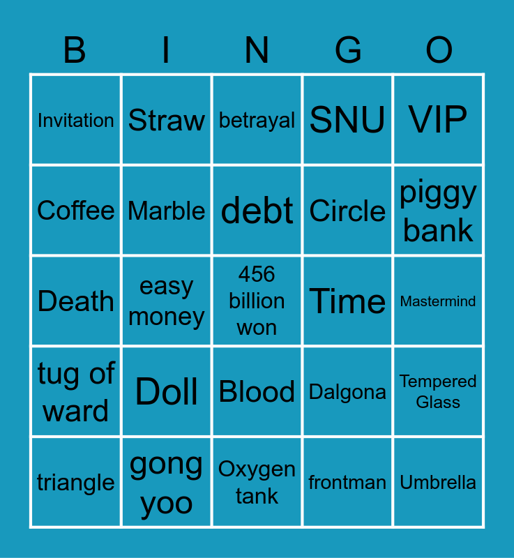 This bingo card has 25 words: Doll, Oxygen tank, debt, triangle, VIP, Invitation, Coffee, Straw, Time, Blood, Circle, Death, Dalgona, Tempered Glass, Marble, Umbrella, Mastermind, betrayal, piggy bank, easy money, 456 billion won, gong yoo, tug of ward, SNU and frontman.