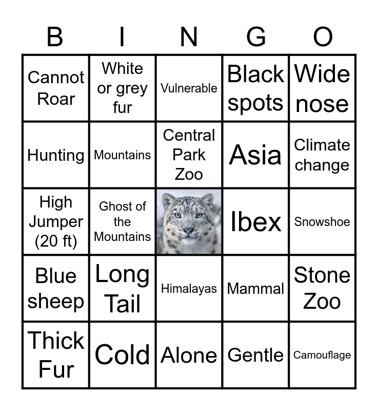 This bingo card has a free space and 29 words: Thick Fur, Long Jumper (50 ft), Ghost of the Mountains, Marathon, Cannot Roar, Vulnerable, Mountains, Long Tail, Ibex, Cold, Snowshoe, Camouflage, Alone, Gentle, Climate change, Shy, Himalayas, Blue sheep, Wide nose, High Jumper (20 ft), Mammal, Smallest of the Big Cats, Asia, Hunting, Black spots, White or grey fur, Stone Zoo, Central Park Zoo and 3,500-7,000 in the Wild.