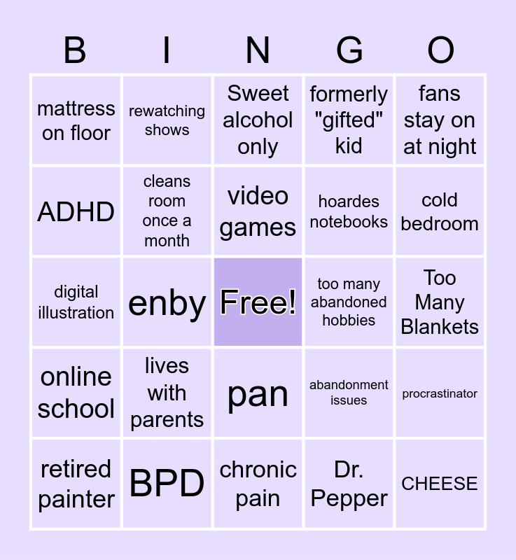 This bingo card has a free space and 24 words: lives with parents, BPD, video games, retired painter, fans stay on at night, mattress on floor, ADHD, rewatching shows, too many abandoned hobbies, pan, hoardes notebooks, digital illustration, abandonment issues, procrastinator, cleans room once a month, Dr. Pepper, Too Many Blankets, Sweet alcohol only, cold bedroom, enby, CHEESE, online school, formerly "gifted" kid and chronic pain.