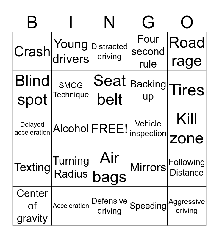 This bingo card has a free space and 24 words: Turning Radius, Acceleration, Seat belt, Center of gravity, Road rage, Crash, Blind spot, Young drivers, Vehicle inspection, Air bags, Backing up, Delayed acceleration, Mirrors, Following Distance, SMOG Technique, Speeding, Kill zone, Distracted driving, Tires, Alcohol, Aggressive driving, Texting, Four second rule and Defensive driving.