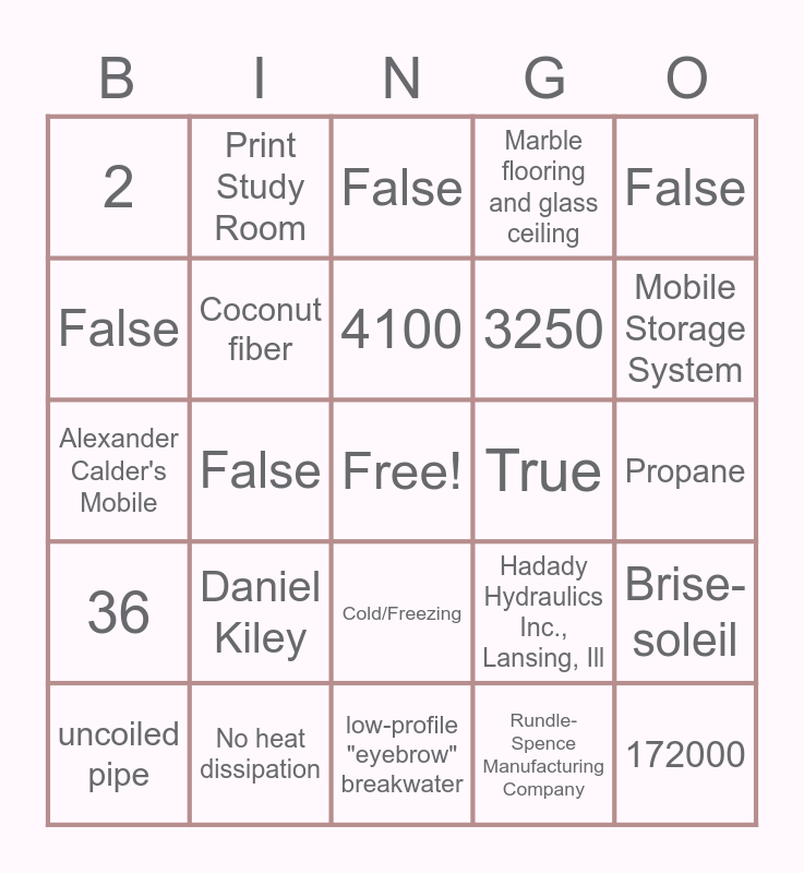 This bingo card has a free space and 45 words: 2, 172000, 3.5, uncoiled pipe, 25,000 feet of 1/2-inch, Rundle-Spence Manufacturing Company, False, 30%, False, No heat dissipation, Marble flooring and glass ceiling, True, Cold/Freezing, Daniel Kiley, thermal protection, low-profile "eyebrow" breakwater, Museum Store, Alexander Calder's Mobile, Baumgartner Terrace, Mobile Storage System, Print Study Room, False, Jim DeYoung, 2, Tim Becker, Propane, 11, 0° to 140° F, Hadady Hydraulics Inc., Lansing, Ill, 36, wind, Brise-soleil, Boeing 747, 23, 10, False, 2014, 234, 77500, 4100, False, 3250, Biotrays, Coconut fiber and True.