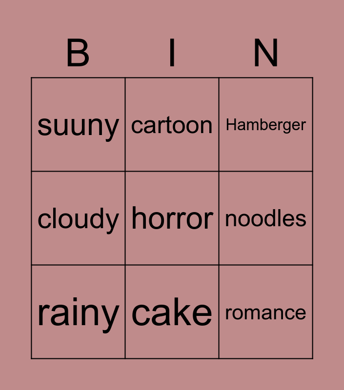 This bingo card has a free space and 8 words: noodles, Hamberger, cartoon, rainy, suuny, romance, cloudy and cake.