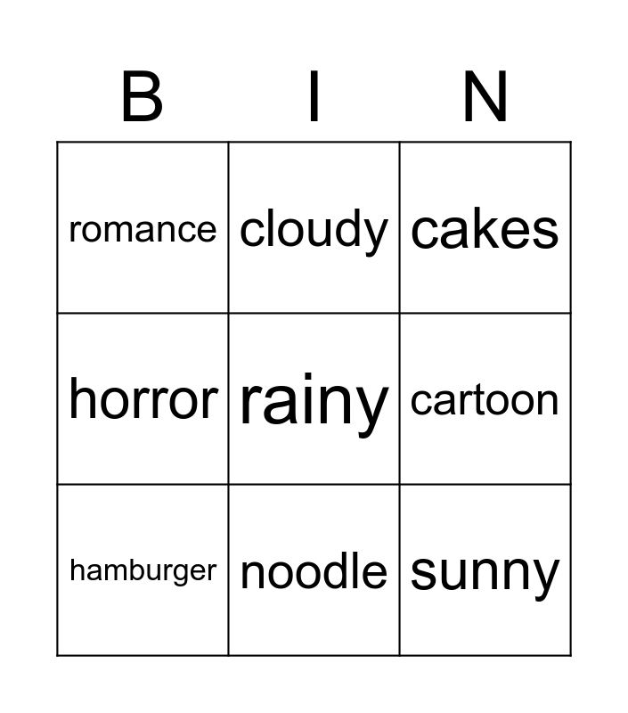 This bingo card has a free space and 8 words: cartoon, cakes, cloudy, hamburger, romance, sunny, horror and noodle.