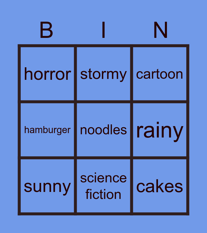 This bingo card has a free space and 8 words: rainy, cartoon, stormy, sunny, horror, cakes, hamburger and science fiction.