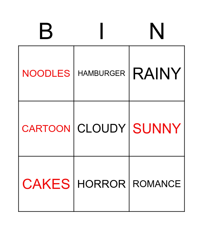 This bingo card has a free space and 8 words: CARTOON, HAMBURGER, SUNNY, CAKES, RAINY, NOODLES, HORROR and ROMANCE.