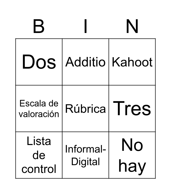 This bingo card has a free space and 8 words: Tres, Kahoot, Additio, Lista de control, Dos, No hay, Escala de valoración and Informal-Digital.
