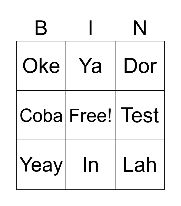 This bingo card has a free space and 8 words: Test, Dor, Ya, Yeay, Oke, Lah, Coba and In.