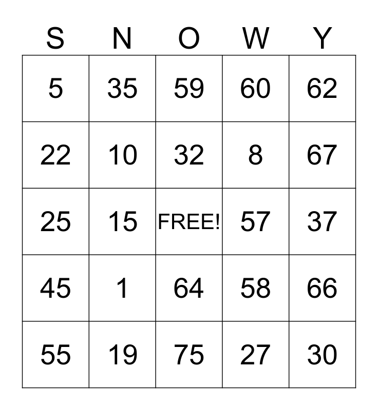 This bingo card has a free space and 24 words: 1, 19, 32, 55, 62, 5, 22, 35, 57, 64, 8, 25, 58, 66, 10, 27, 37, 59, 67, 15, 30, 45, 60 and 75.