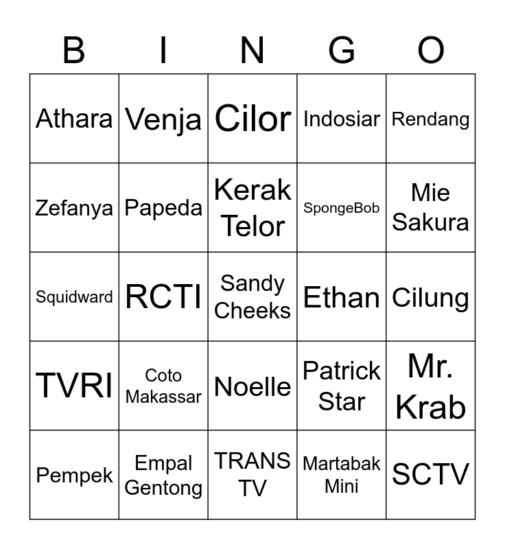 This bingo card has a free space and 24 words: Coto Makassar, Empal Gentong, Kerak Telor, Pempek, Rendang, Athara, Zefanya, Venja, Ethan, Noelle, SpongeBob, Squidward, Patrick Star, Mr. Krab, Papeda, Martabak Mini, Cilung, Cilor, Mie Sakura, RCTI, SCTV, TVRI, Indosiar and TRANS TV.