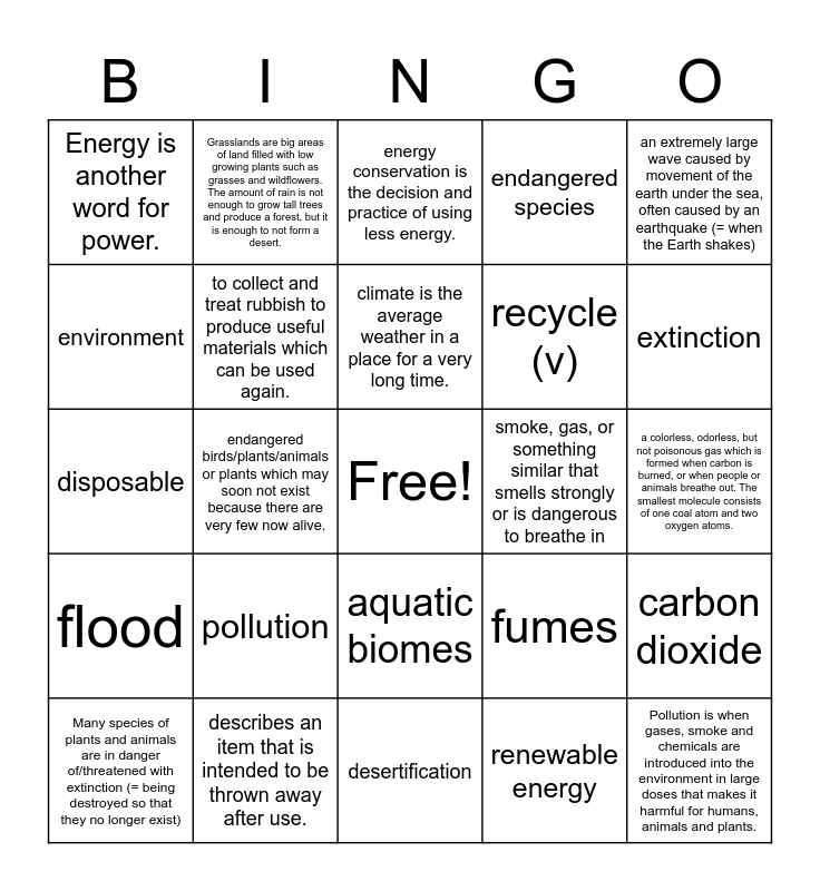 This bingo card has a free space and 89 words: acid rain, acid rain is a rain which contains large amounts of harmful chemicals as a result of burning substances such as coal and oil., aquatic biomes, Marine biomes, freshwater biomes and coral reefs are examples of marine biomes., biodegradable, able to be broken down (=decay) naturally and harmlessly., biodiversity, the variety of life in the world or in a particular area or ecosystem., biome, A biome is a way to describe a large group of similar ecosystems. Biomes have similar weather, rainfall, animals and plants., carbon monoxide, a colorless, odorless, and poisonous gas which is formed by the burning of carbon, especially in the form of car fuel. The smallest molecule consists of one coal atom and one oxygen atom., carbon dioxide, a colorless, odorless, but not poisonous gas which is formed when carbon is burned, or when people or animals breathe out. The smallest molecule consists of one coal atom and two oxygen atoms., climate, climate is the average weather in a place for a very long time., climate change, Climate is the average weather in a place over many years. Climate change is a shift in those average conditions., deforestation, the cutting down of trees in a large area without replacing the trees; the destruction of forests by people., desert, Areas with little or no rainfall, few animals and plants and strong winds are called deserts., desertification, the process by which fertile land becomes desert, typically as a result of drought, deforestation, or inappropriate agriculture., disposable, describes an item that is intended to be thrown away after use., drought, a long period when there is little or no rain., earthquake, a sudden violent movement of the Earth's surface, sometimes causing great damage., endangered species, endangered birds/plants/animals or plants which may soon not exist because there are very few now alive., energy, Energy is another word for power., energy conservation, energy conservation is the decision and practice of using less energy., environment, the air, water and land in or on which people, animals and plants live., extinction, Many species of plants and animals are in danger of/threatened with extinction (= being destroyed so that they no longer exist), flood, a large amount of water covering an area that is usually dry., freshwater biomes =, There are three main types of freshwater biomes: ponds and lakes, streams and rivers, and wetlands., fumes, smoke, gas, or something similar that smells strongly or is dangerous to breathe in, global warming, An increase in the average temperature of the Earth's atmosphere (especially a long-term increase that causes climatic changes), grasslands, Grasslands are big areas of land filled with low growing plants such as grasses and wildflowers. The amount of rain is not enough to grow tall trees and produce a forest, but it is enough to not form a desert., greenhouse effect, Likewise, Earth’s atmosphere traps energy from the Sun. Carbon dioxide and other gases—called greenhouse gases—in the air do this trapping. Without these gases too much heat would go back into space and living things could not survive. However,, Greenpeace, an organization that fights for the protection of the environment., habitat, A habitat is the home of an animal or a plant. Almost every place on Earth —from the hottest desert to the coldest ice pack—is a habitat for some kinds of animals and plants., land biomes, Deserts, grasslands, tundras, tropical rainforests, temperate forests and taigas are examples of land biomes., marine biomes, There are two major aquatic or water biomes, the marine biome and the freshwater biome. The marine biome is primarily made up of the saltwater oceans., natural resources, Materials or substances such as minerals, forests, water, and fertile land that occur in nature and can be used for economic gain., Example: Some natural resources, such as natural gas and fossil fuel, cannot be replaced., oil spill, a word used to describe a situation when oil is accidentally released into the environment by humans. Spilled or leaked oil can contaminate water, making it dangerous for animals and humans who live near the place where the oil spill., The term oil slick often refers to marine oil spills, where oil is released into the ocean or coastal waters., ozone layer, a layer of air high above the Earth, which contains a lot of ozone, and which prevents harmful ultraviolet light from the sun from reaching the Earth., Example: Scientists believe that there is a hole in the ozone layer., pollution, Pollution is when gases, smoke and chemicals are introduced into the environment in large doses that makes it harmful for humans, animals and plants., precipitation, Precipitation is the release of water from the sky. It is a term in meteorology, and includes rain, snow, sleet, dew, frost, and hail., recycle (v), to collect and treat rubbish to produce useful materials which can be used again., renewable energy, a form of energy that can be produced as quickly as it is used because it has a theoretically unlimited supply and is therefore not depleted when used by humans., sustainable development, a development that is causing little or no damage to the environment and therefore able to continue for a long time., tsunami, an extremely large wave caused by movement of the earth under the sea, often caused by an earthquake (= when the Earth shakes), taiga, The Taiga is one of the three main forest biomes. The other two are the temperate forest and the tropical rainforest. The taiga is the driest and coldest of the forest biomes. It is sometimes called the coniferous forest (=barrskog) or the boreal, temperate forest, A temperate forest has four distinct seasons: spring, summer, fall and winter. The trees in such forests have leaves that grow in the spring, are green in the summer and becomes red in the autumn. During the winter, these trees have no leaves at, tro