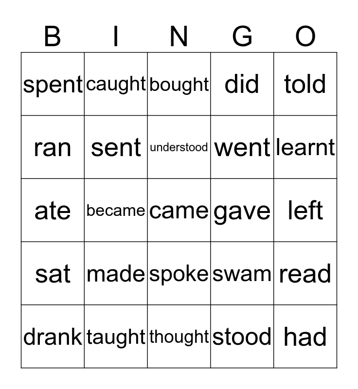 This bingo card has 25 words: made, thought, understood, drank, told, spent, ran, caught, gave, spoke, went, ate, swam, read, sent, had, left, bought, learnt, became, came, taught, sat, did and stood.