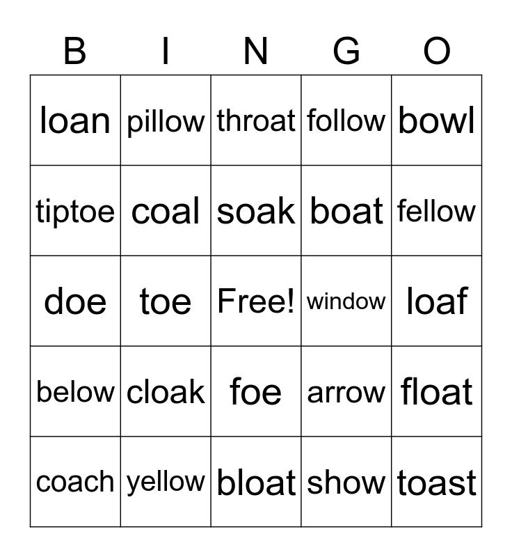 This bingo card has a free space and 24 words: cloak, yellow, soak, coach, bowl, loan, tiptoe, pillow, window, foe, boat, doe, arrow, float, coal, show, loaf, throat, fellow, toe, toast, below, follow and bloat.