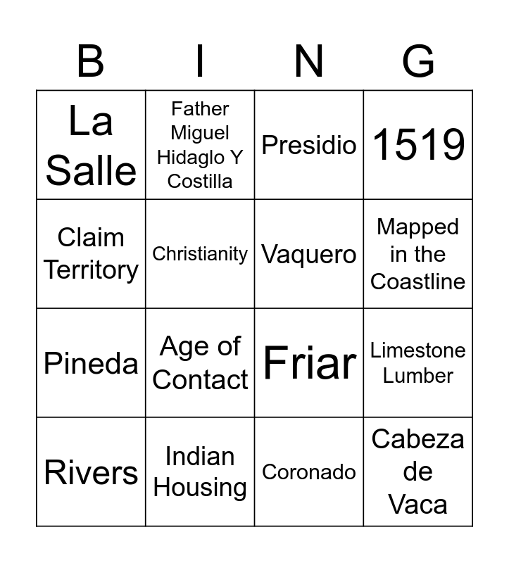 This bingo card has 22 words: Indian Housing, Disease, Father Miguel Hidaglo Y Costilla, Mexican Indepedence, Christianity, Vaquero, La Salle, Presidio, Friar, Cabeza de Vaca, Pineda, 1519, 1718, 1821, Coronado, Cibola, Limestone Lumber, Rivers, Age of Contact, Claim Territory, Mapped in the Coastline and Columbus sailed the ocean blue.