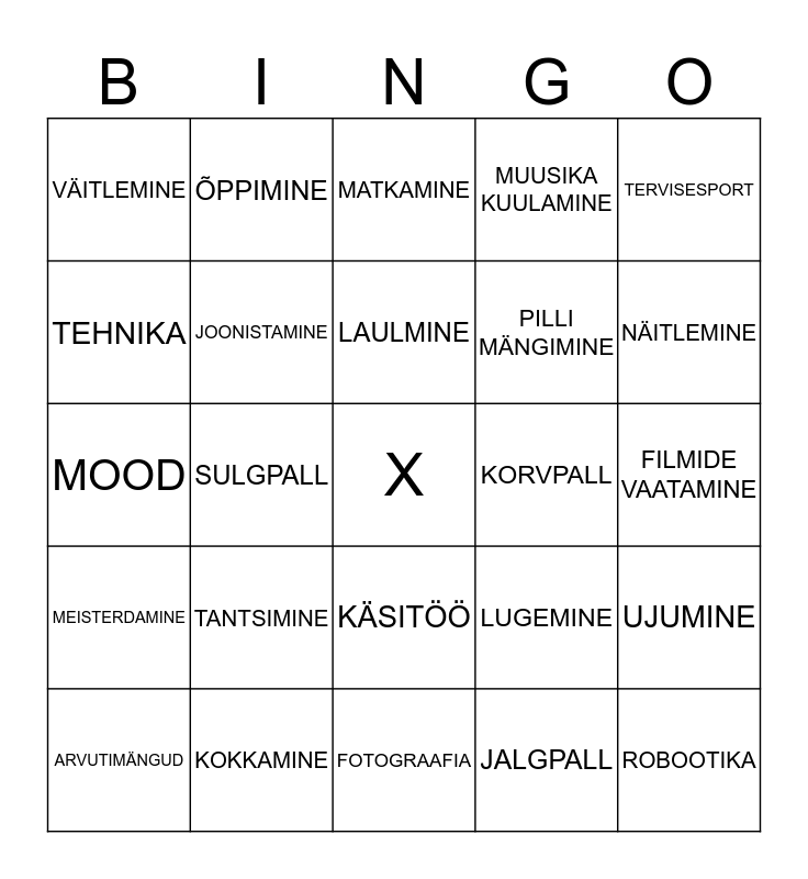 This bingo card has a free space and 24 words: TANTSIMINE, KOKKAMINE, LAULMINE, ARVUTIMÄNGUD, TERVISESPORT, VÄITLEMINE, TEHNIKA, ÕPPIMINE, KORVPALL, KÄSITÖÖ, PILLI MÄNGIMINE, MOOD, LUGEMINE, UJUMINE, JOONISTAMINE, JALGPALL, FILMIDE VAATAMINE, MATKAMINE, NÄITLEMINE, SULGPALL, ROBOOTIKA, MEISTERDAMINE, MUUSIKA KUULAMINE and FOTOGRAAFIA.