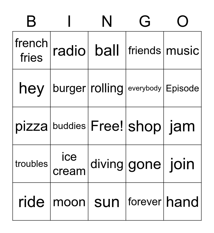This bingo card has a free space and 28 words: join, band, everybody, forever, hey, ball, radio, troubles, shop, ride, pizza, friends, moon, sun, Episode, rocking, ice cream, burger, rolling, diving, french fries, need, hand, buddies, jam, gone, music and worries.