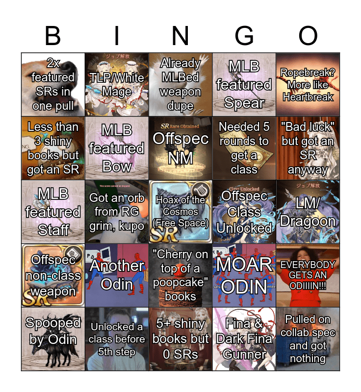 This bingo card has 24 images, a free space and 24 words: Spooped by Odin, Another Odin, Offspec NM, Fina & Dark Fina Gunner, Ropebreak? More like Heartbreak, 2x featured SRs in one pull, TLP/White Mage, Already MLBed weapon dupe, Offspec Class Unlocked, LM/ Dragoon, MLB featured Staff, MLB featured Bow, MOAR ODIN, EVERYBODY GETS AN ODIIIIN!!!, Less than 3 shiny books but got an SR, Unlocked a class before 5th step, 5+ shiny books but 0 SRs, MLB featured Spear, "Bad luck" but got an SR anyway, Offspec non-class weapon, Got an orb from RG grim, kupo, "Cherry on top of a poopcake" books, Needed 5 rounds to get a class and Pulled on collab spec and got nothing.