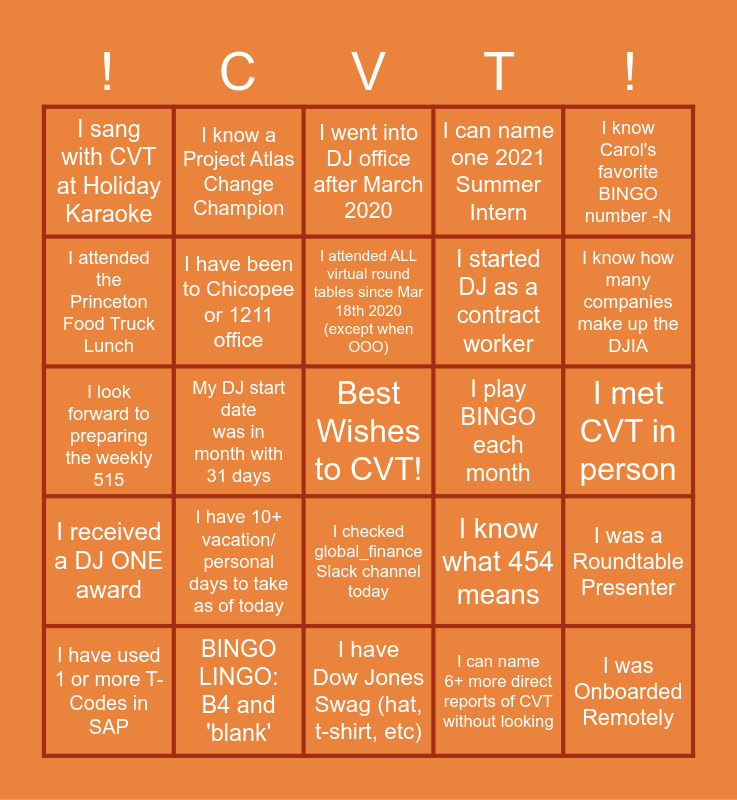 This bingo card has a free space and 24 words: I have 10+ vacation/ personal days to take as of today, BINGO LINGO: B4 and 'blank', I attended ALL virtual round tables since Mar 18th 2020 (except when OOO), I have used 1 or more T-Codes in SAP, I know Carol's favorite BINGO number -N, I sang with CVT at Holiday Karaoke, I attended the Princeton Food Truck Lunch, I know a Project Atlas Change Champion, I play BINGO each month, I checked global_finance Slack channel today, I started DJ as a contract worker, I look forward to preparing the weekly 515, I know what 454 means, I was a Roundtable Presenter, I have been to Chicopee or 1211 office, I can name 6+ more direct reports of CVT without looking, I met CVT in person, I went into DJ office after March 2020, I know how many companies make up the DJIA, My DJ start date was in month with 31 days, I was Onboarded Remotely, I received a DJ ONE award, I can name one 2021 Summer Intern and I have Dow Jones Swag (hat, t-shirt, etc).
