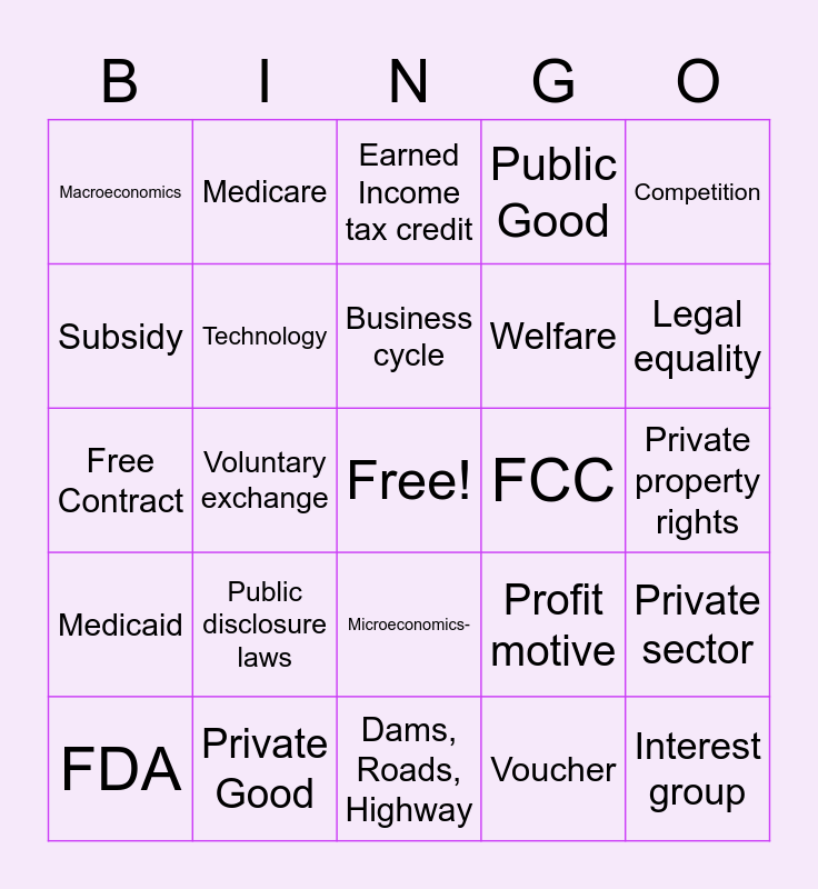 This bingo card has a free space and 28 words: Private sector, Free rider, Welfare, Voucher, Subsidy, Earned Income tax credit, Medicare, Medicaid, FCC, FDA, Free Contract, Public Good, Private Good, Dams, Roads, Highway, Legal equality, Public interest, Public disclosure laws, Technology, Business cycle, Microeconomics-, Macroeconomics, Federal Regulatory Agencies, Interest group, Voluntary exchange, Private property rights, Profit motive, Competition and Public sector.
