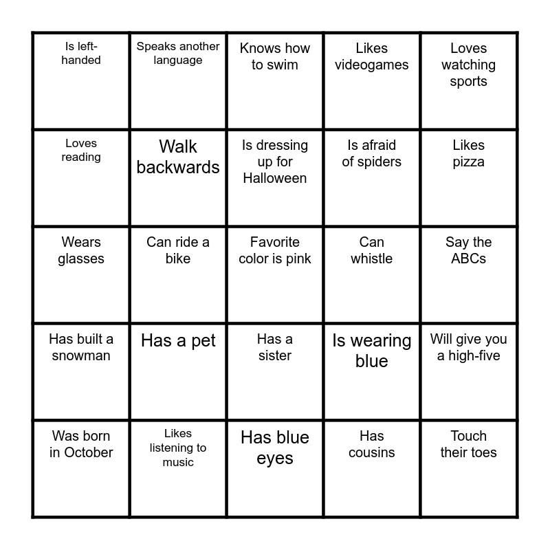This bingo card has 25 words: Has a pet, Has blue eyes, Is dressing up for Halloween, Was born in October, Loves watching sports, Is left-handed, Loves reading, Speaks another language, Can whistle, Has a sister, Is afraid of spiders, Wears glasses, Is wearing blue, Will give you a high-five, Walk backwards, Touch their toes, Say the ABCs, Knows how to swim, Likes pizza, Can ride a bike, Favorite color is pink, Likes listening to music, Has built a snowman, Likes videogames and Has cousins.