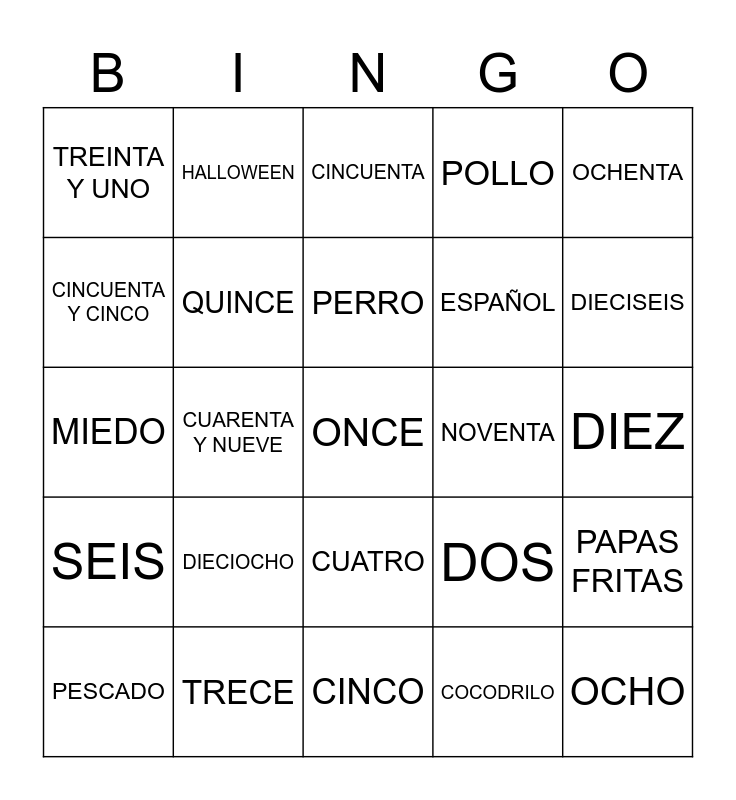 This bingo card has 30 words: TRECE, VEINTE, CUARENTA Y NUEVE, TRES, TREINTA Y UNO, CINCUENTA, QUINCE, CUATRO, NOVENTA, CINCO, DIEZ, ONCE, COCODRILO, OCHO, DIECISEIS, DOCE, DOS, SEIS, DIECIOCHO, OCHENTA, MIEDO, HISTORIA, HALLOWEEN, ESPAÑOL, CINCUENTA Y CINCO, POLLO, PAPAS FRITAS, PESCADO, PERRO and CABALLO.