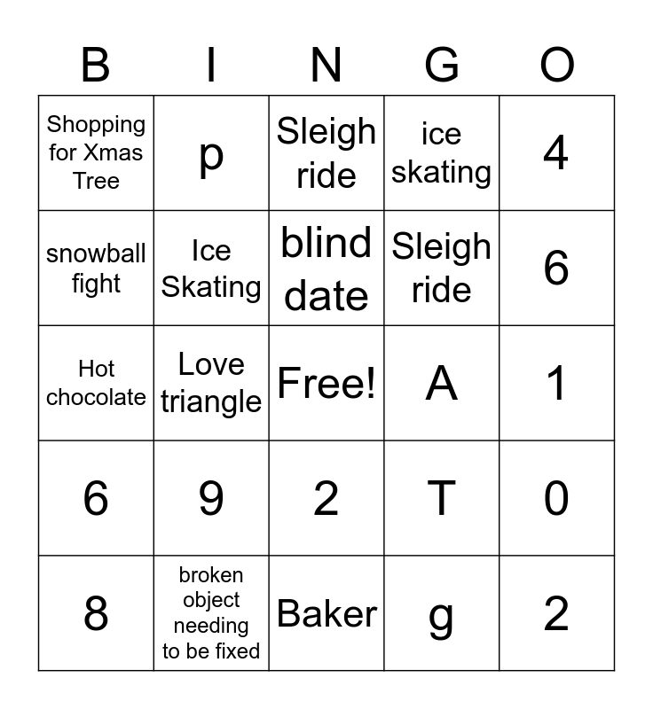 This bingo card has a free space and 31 words: Baker, Meddling family, Love triangle, Christmas market, Shopping for Xmas Tree, Sleigh ride, Ice Skating, T, A, g, 1, 2, 3, 5, 6, 8, 0, 9, 6, 2, 4, 6, 8, p, Sleigh ride, snowball fight, ice skating, Hot chocolate, broken object needing to be fixed, blind date and Xmas Cookies.