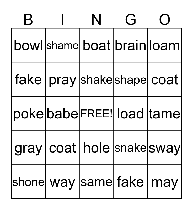 This bingo card has a free space and 24 words: coat, way, shake, shone, loam, bowl, fake, shame, load, hole, shape, poke, snake, sway, pray, fake, tame, boat, coat, babe, may, gray, brain and same.