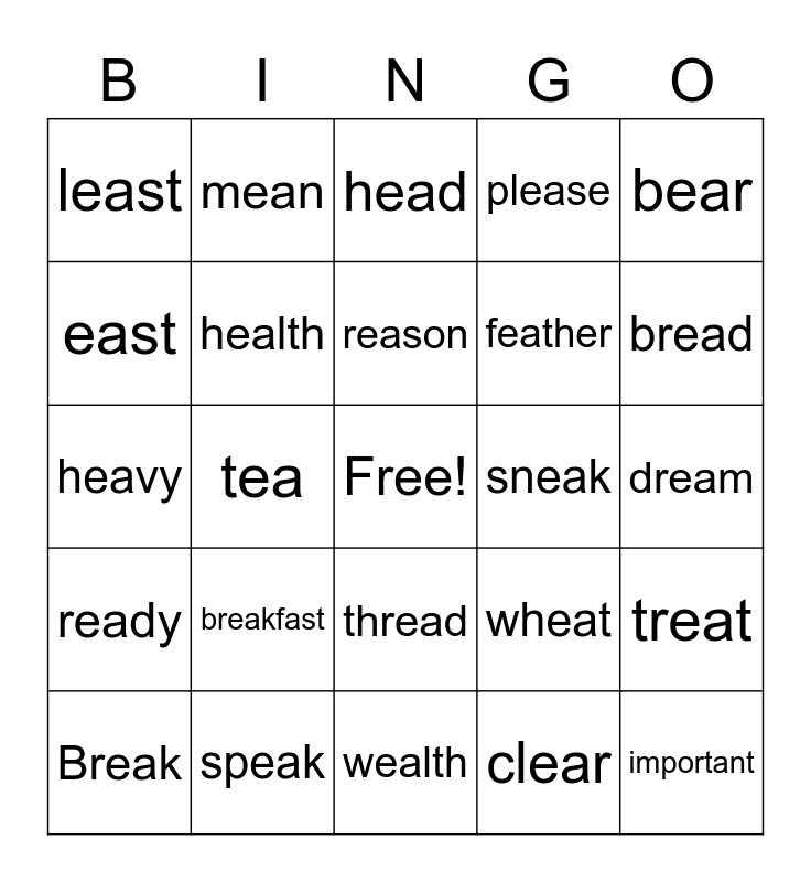 This bingo card has a free space and 29 words: Break, eat, tea, meal, least, head, health, breakfast, sneak, speak, dream, important, wealth, clear, bread, heat, thread, ready, bear, heavy, wheat, fear, feather, east, please, mean, treat, reason and near.