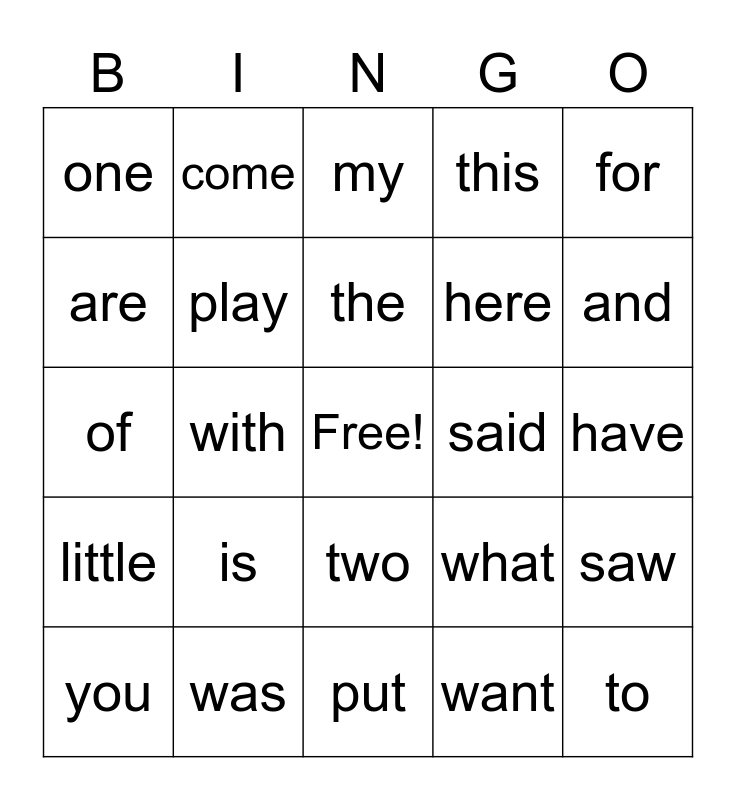 This bingo card has a free space and 24 words: is, was, the, you, for, one, are, come, said, two, here, of, what, saw, play, want, have, my, and, with, to, little, this and put.